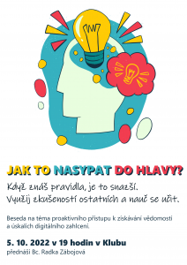 Ve středu 5. 10. 2022 v 19 hodin bude v Klubu DM beseda na téma proaktivního přístupu k získávání vědomostí a úskalích digitálního zahlcení. Přednáší Bc. Radka Zábojová.